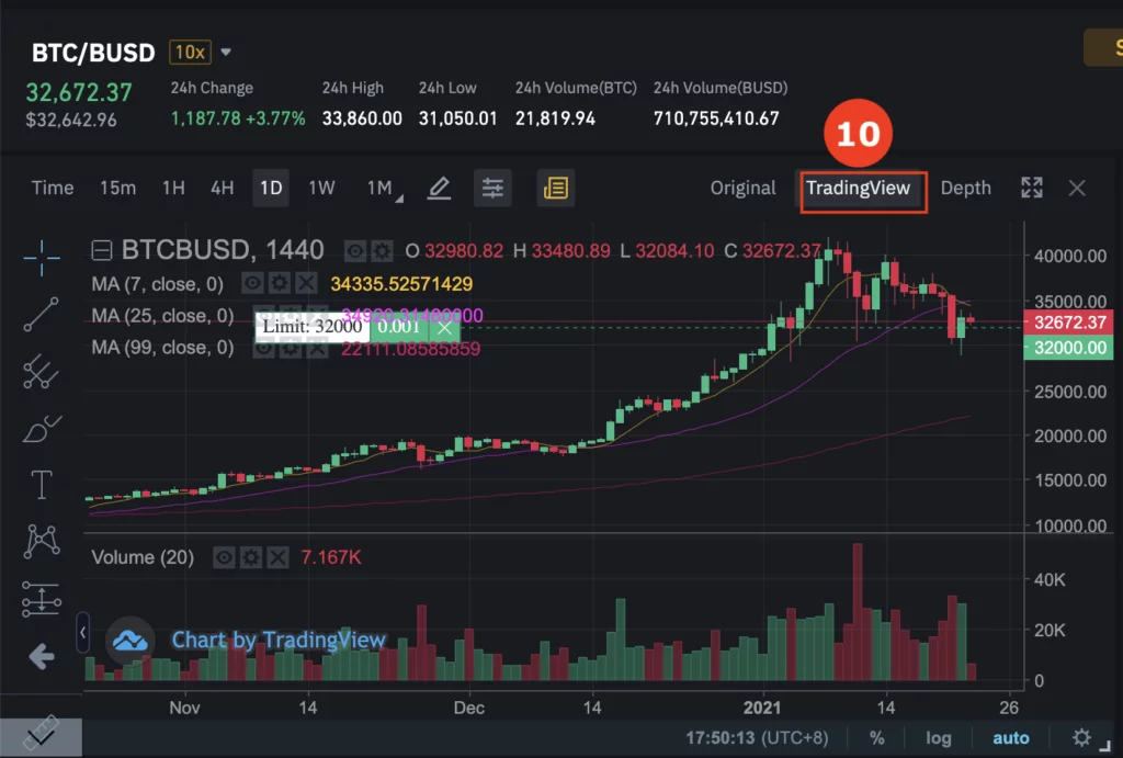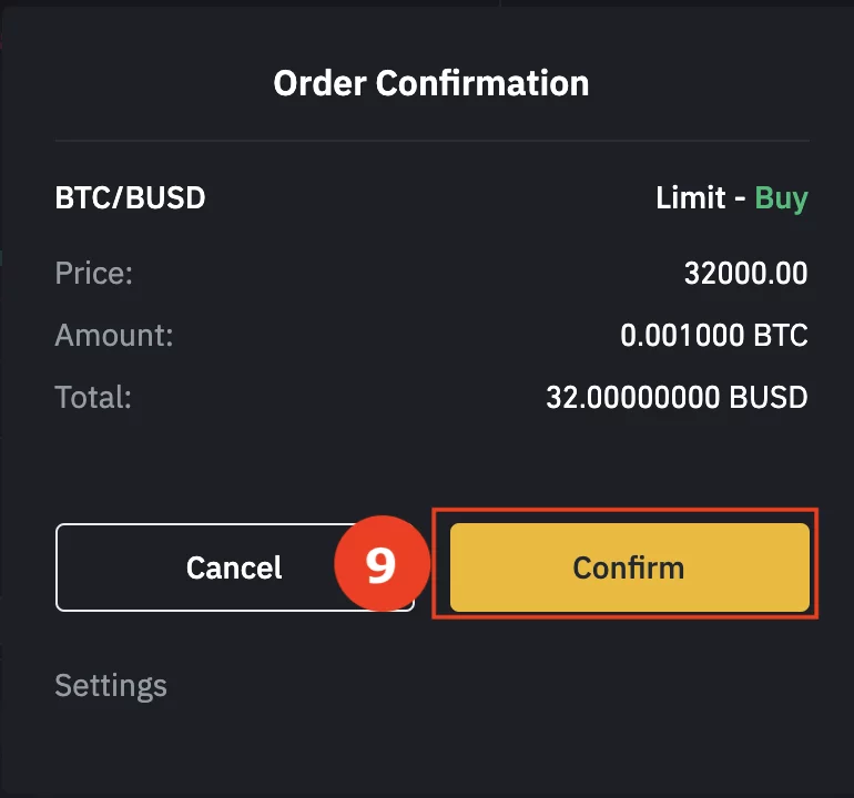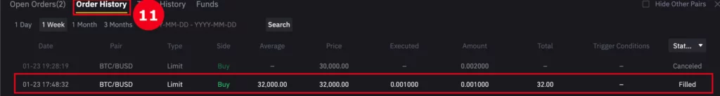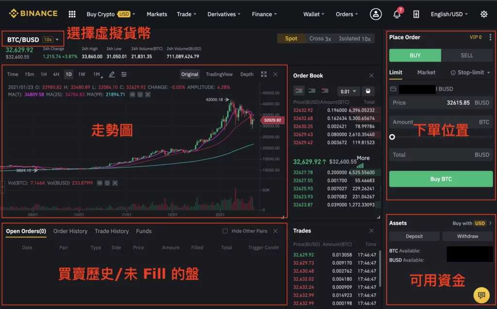於右方填入你希望買入的價格及數量,並按 “Buy BTC”。假設 Price = 32,000 和 Amount = 0.001,你將會以美金 (BUSD) $32 購入 0.001 BTC。概念上與外幣兌換一樣。
